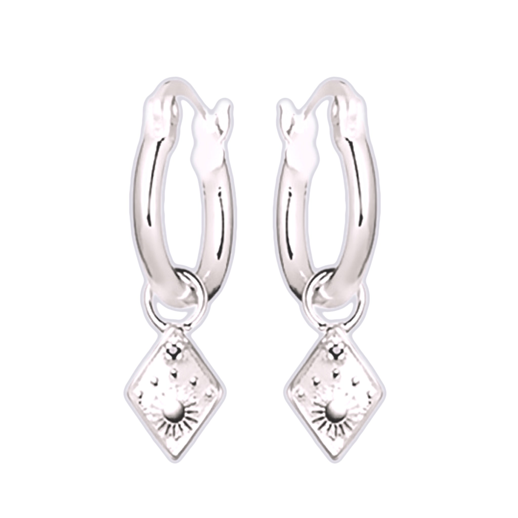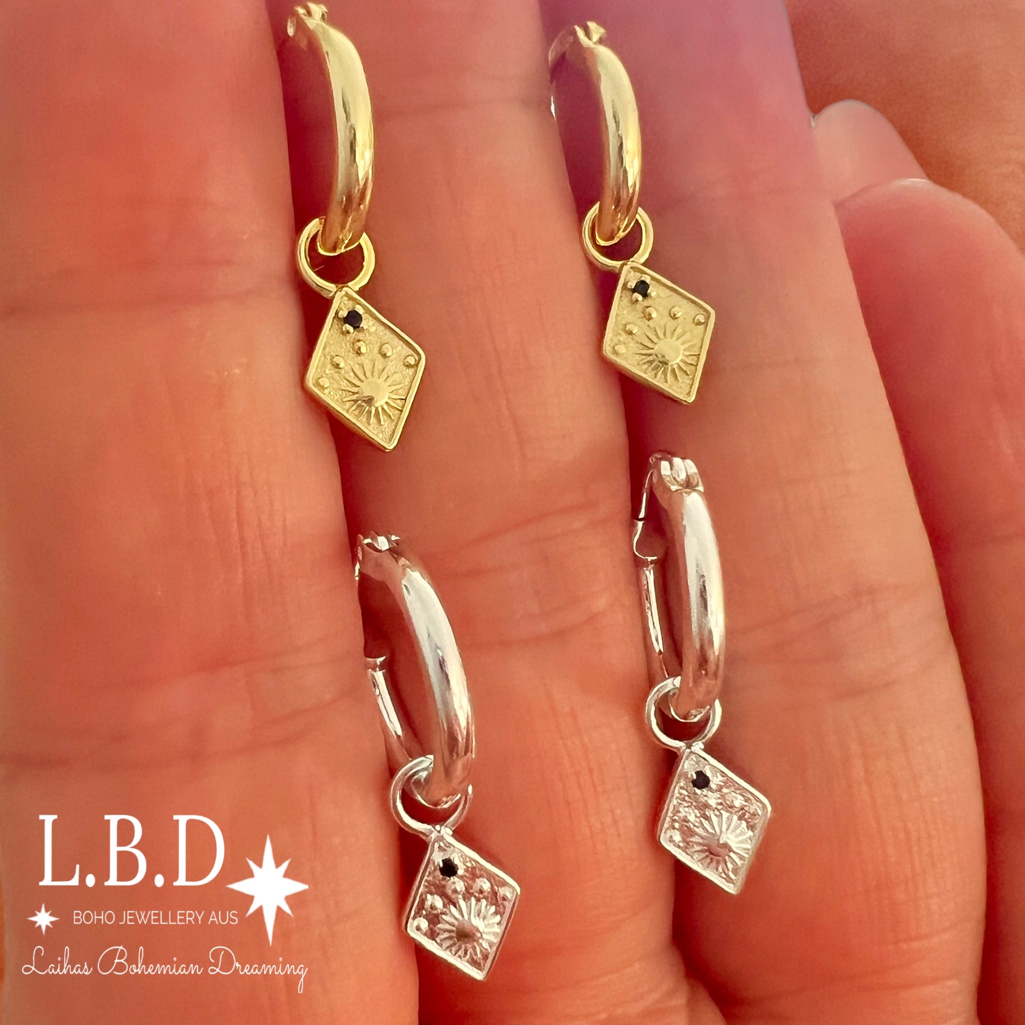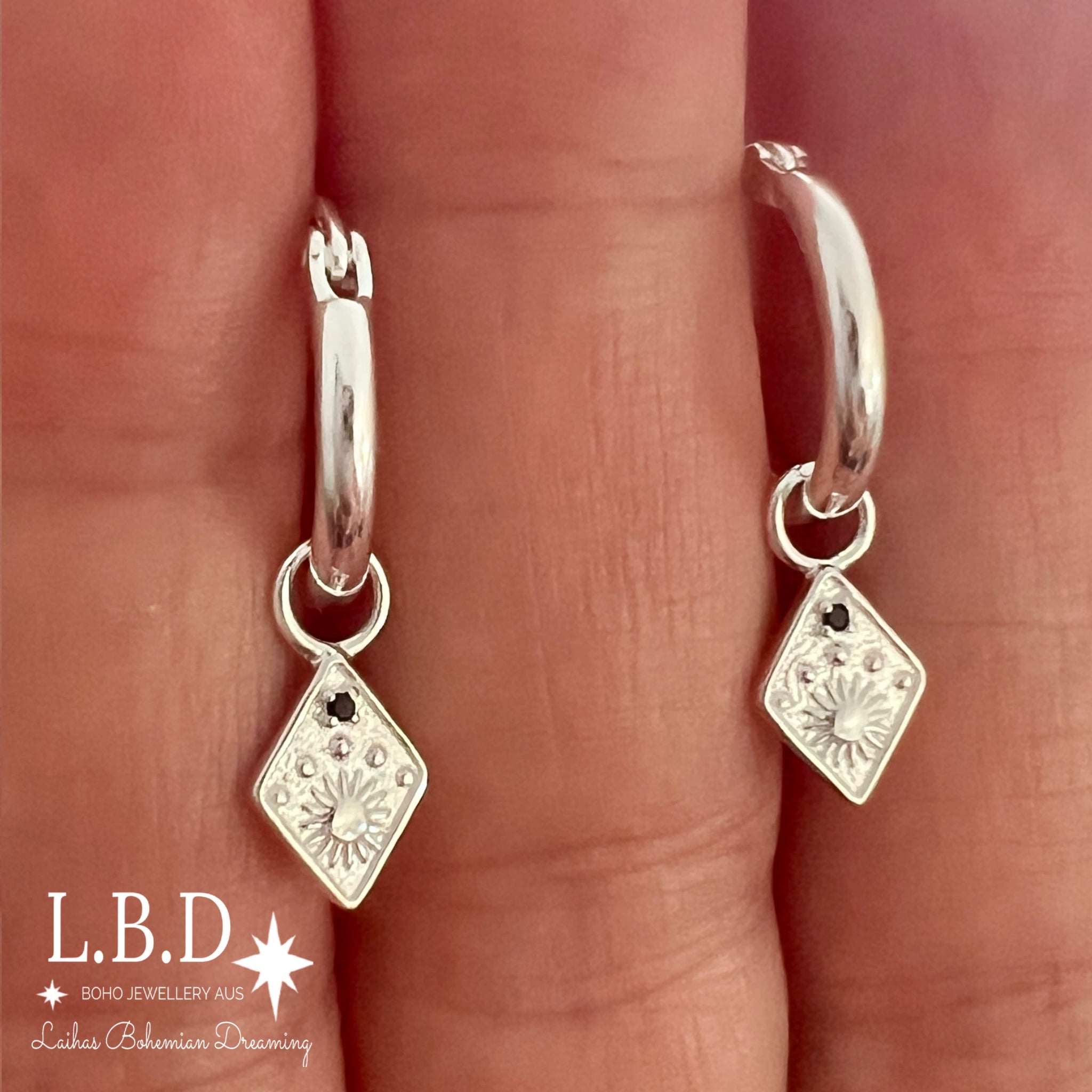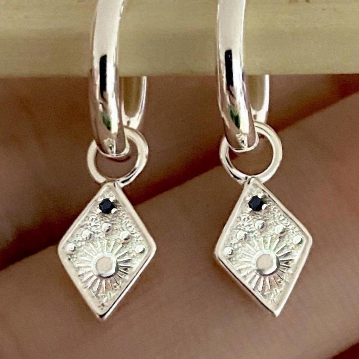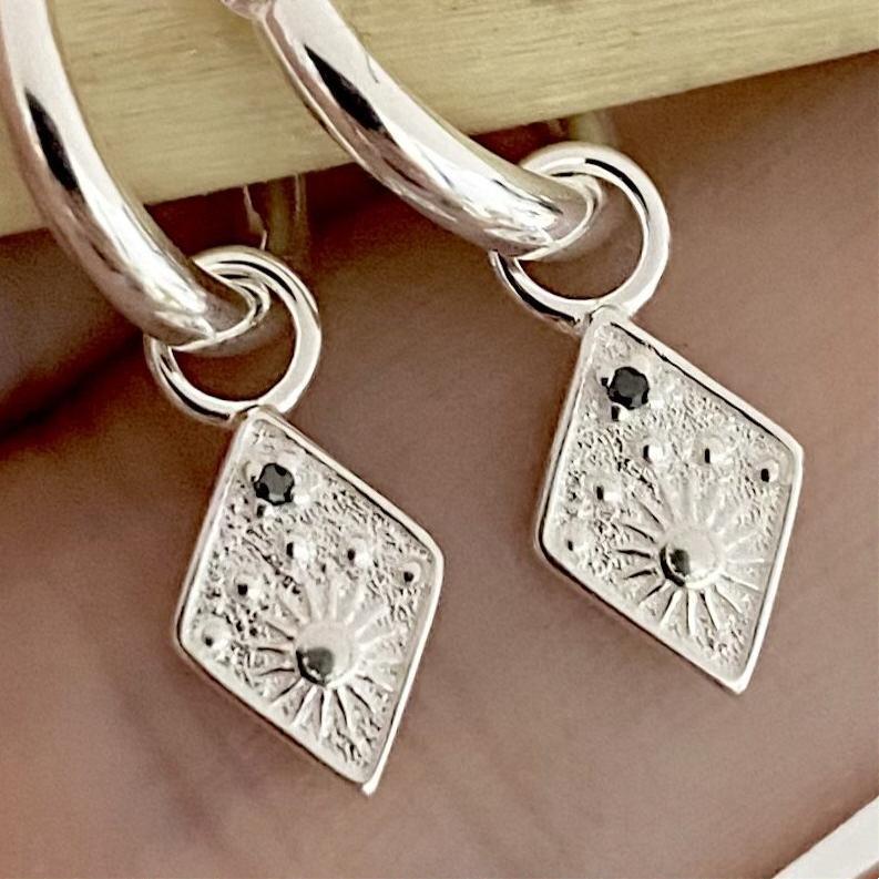 Gorgeous Prestige Sterling Silver Boho Hoop Earrings with Gorgeous Detailed Charms with Black CZ’s for added dazzle.