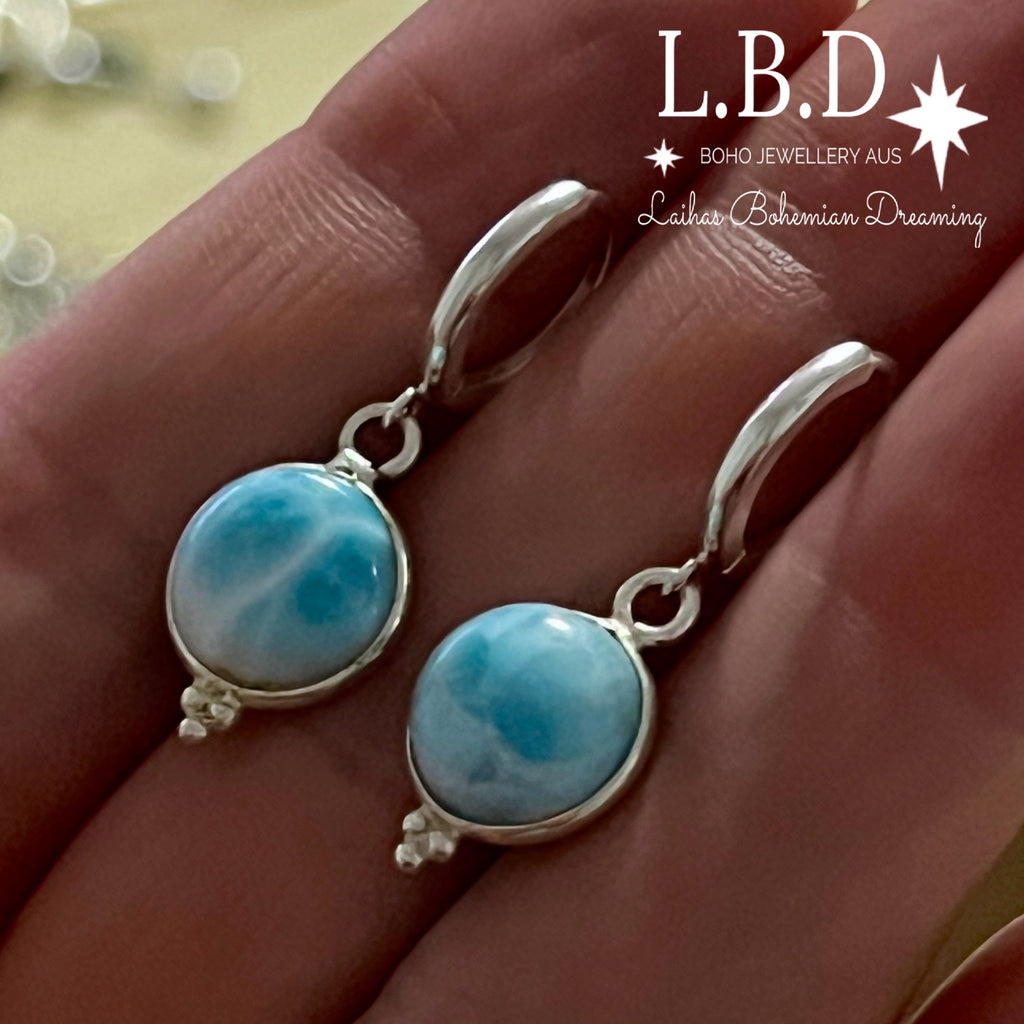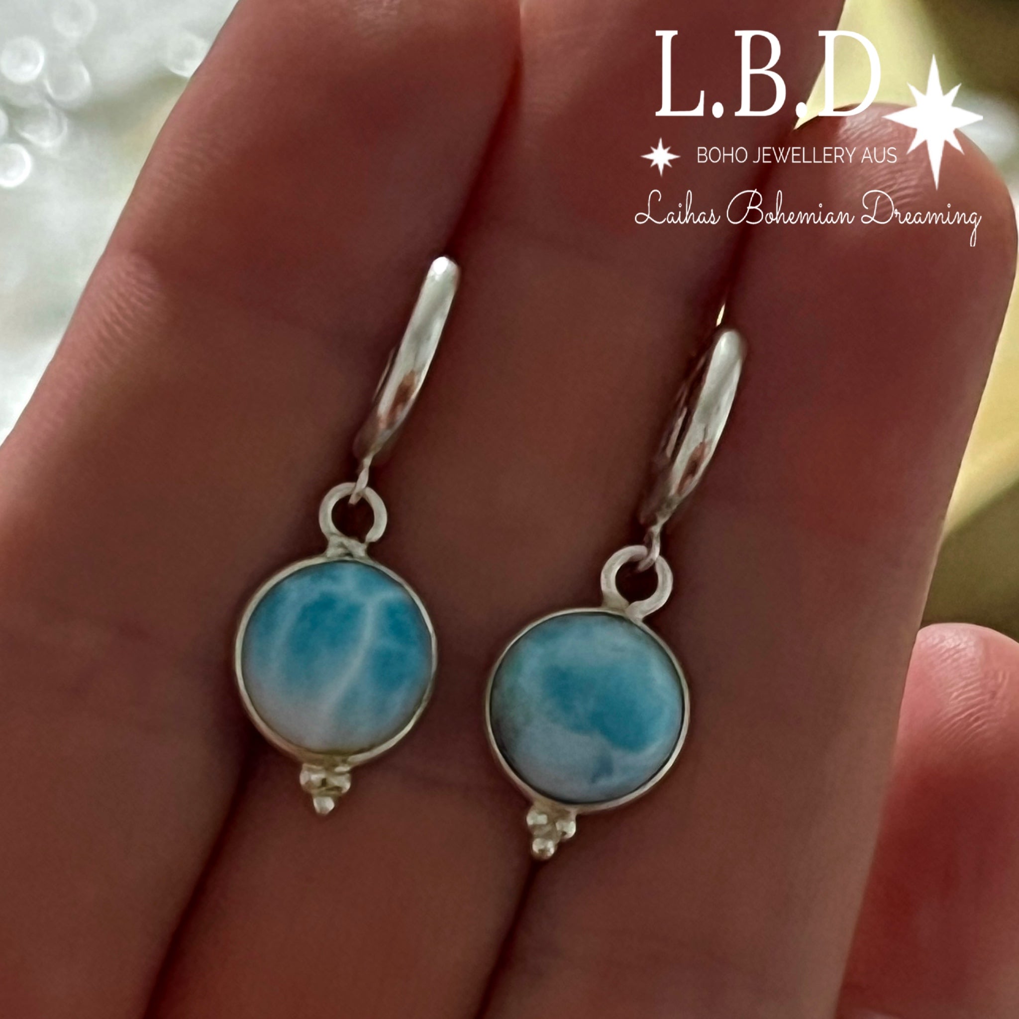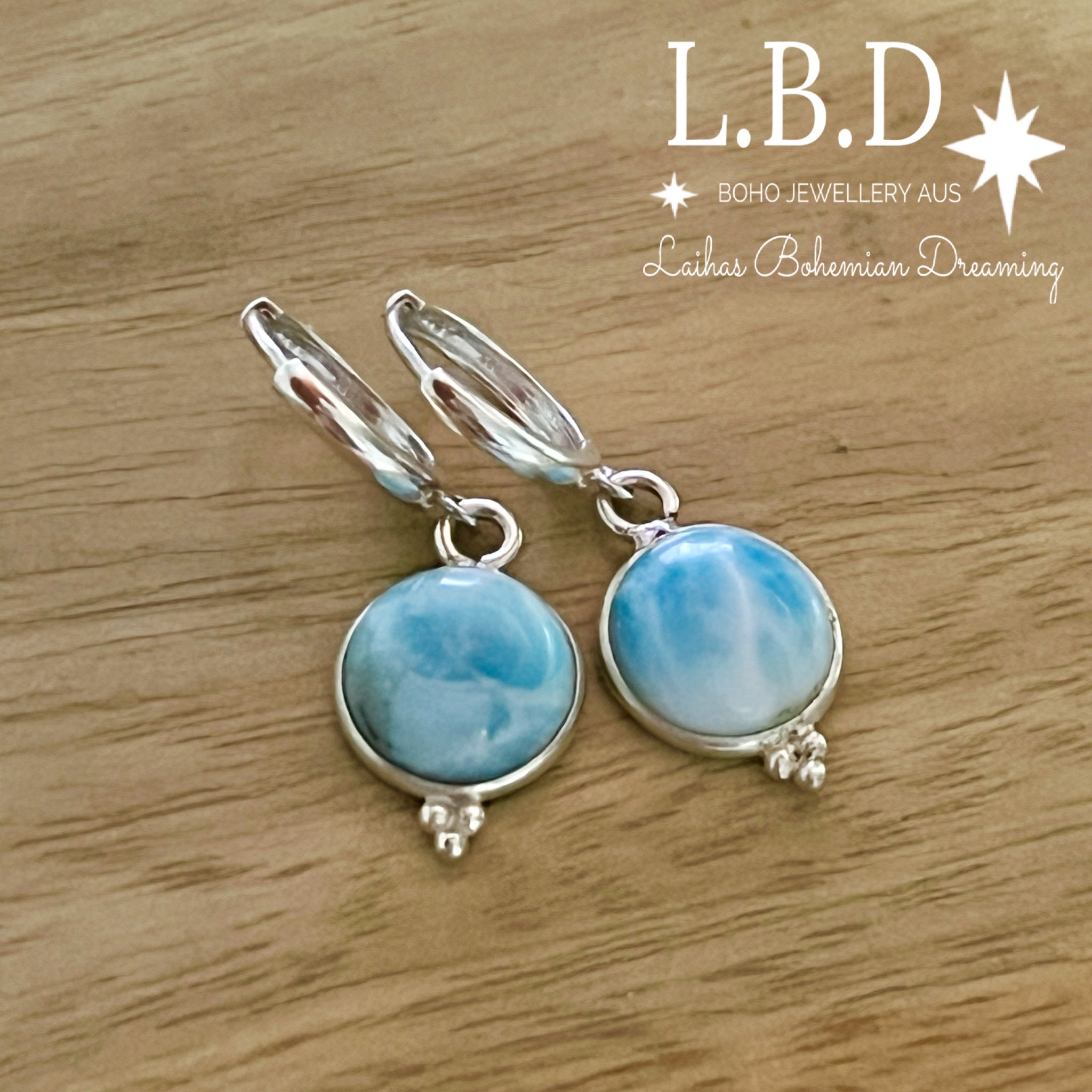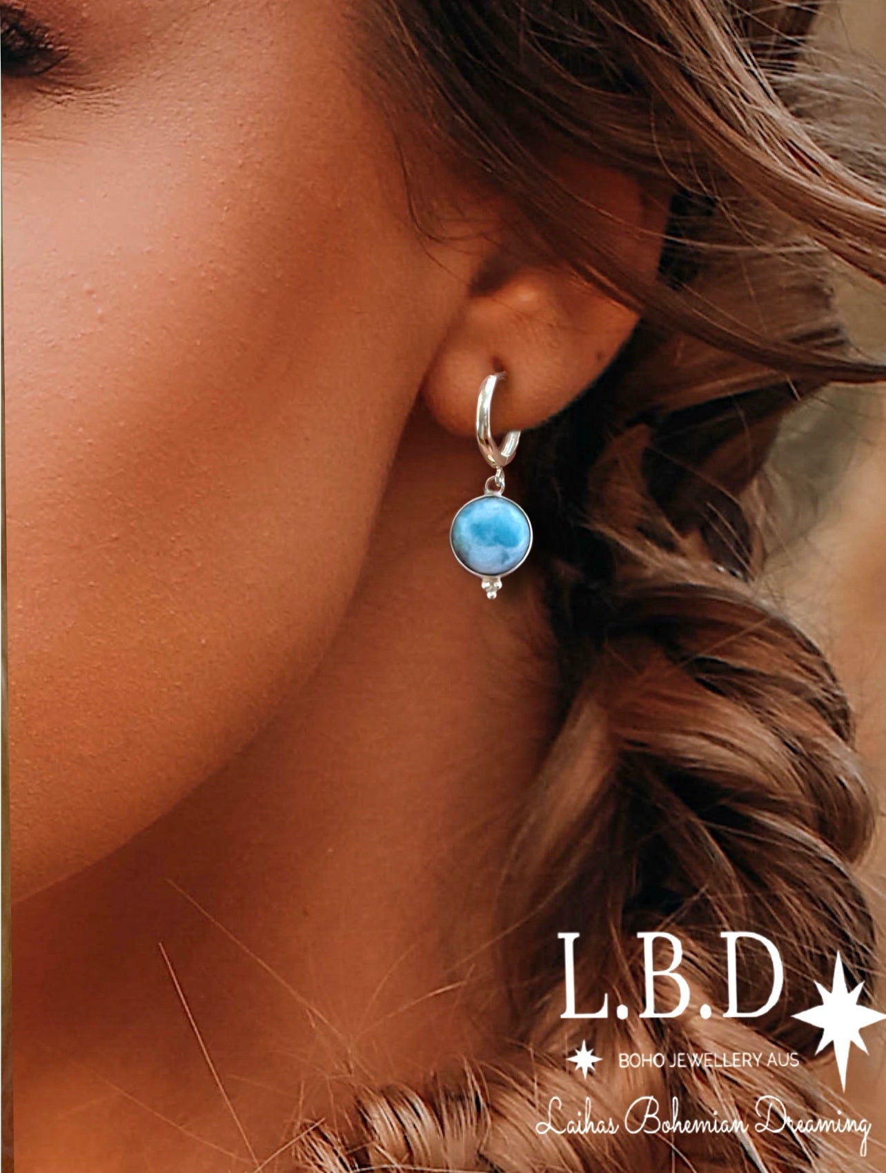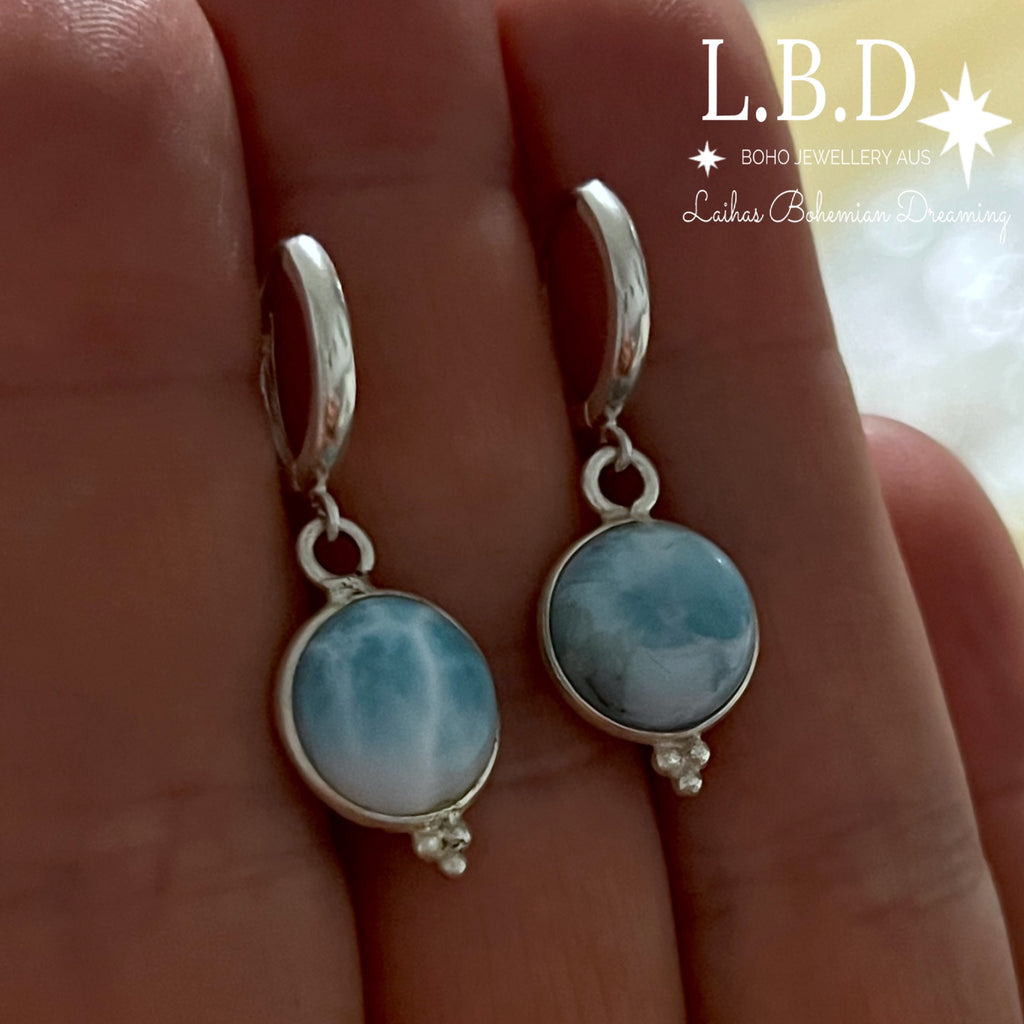Gorgeous Handmade Sterling Silver Mini Larimar Hoop Earrings.