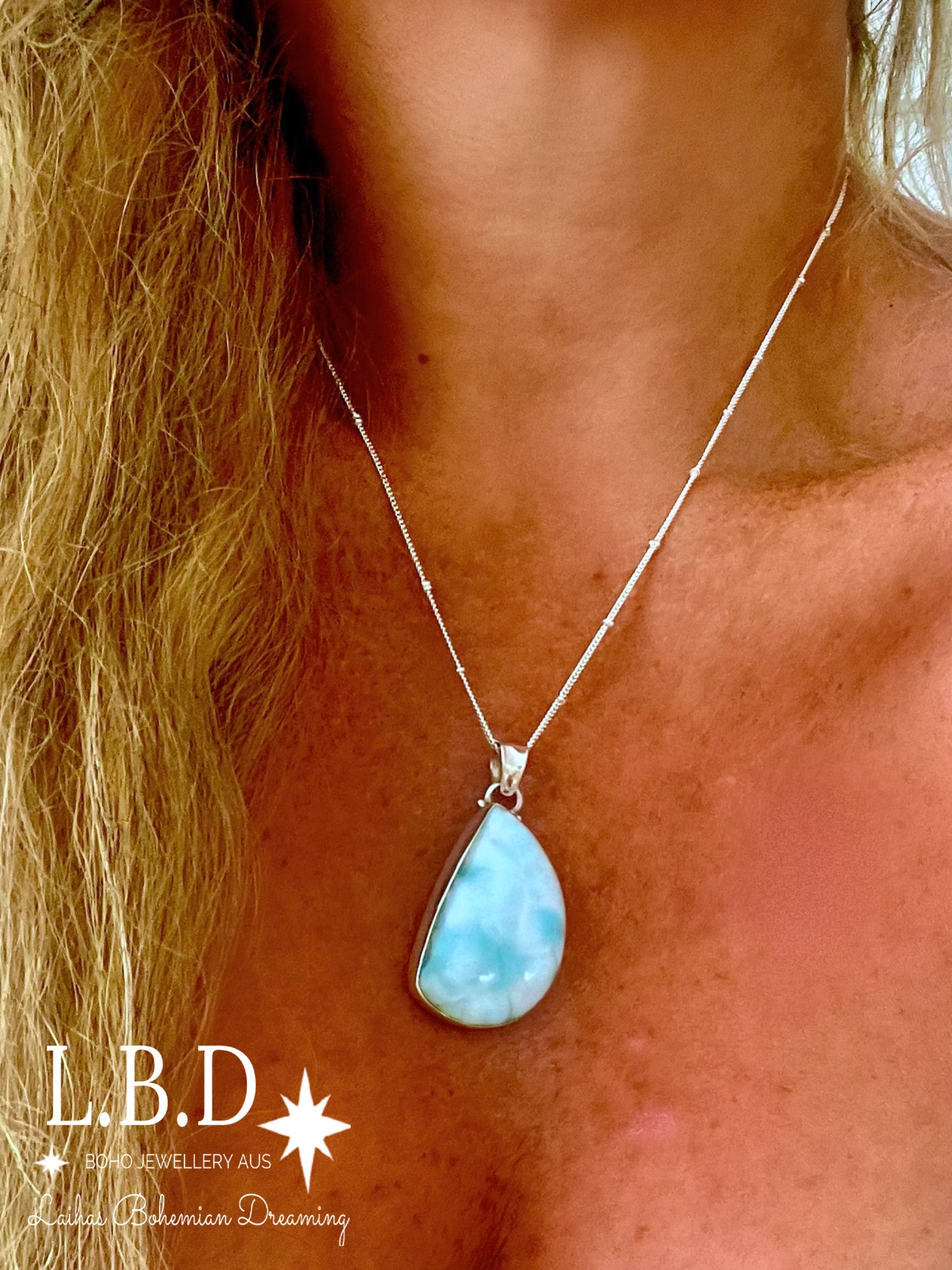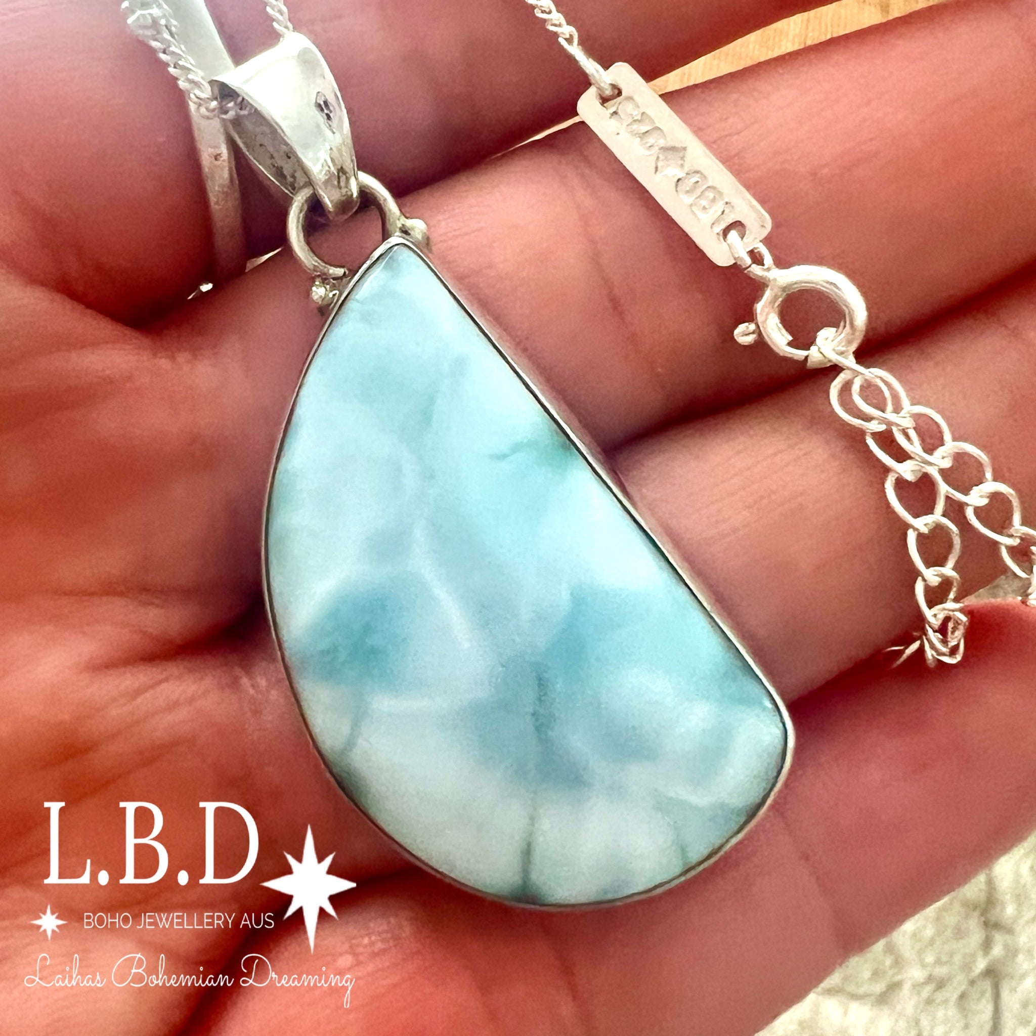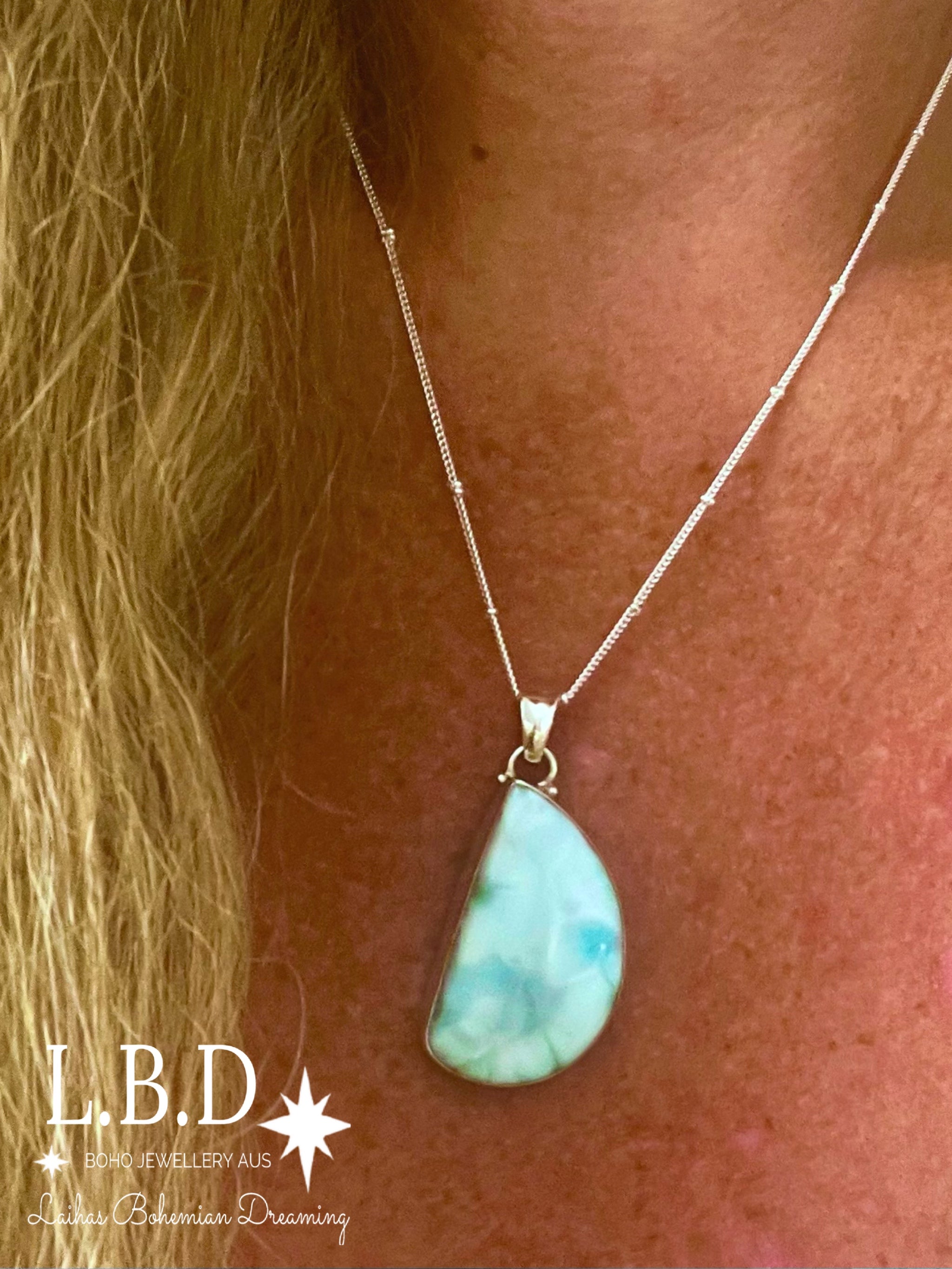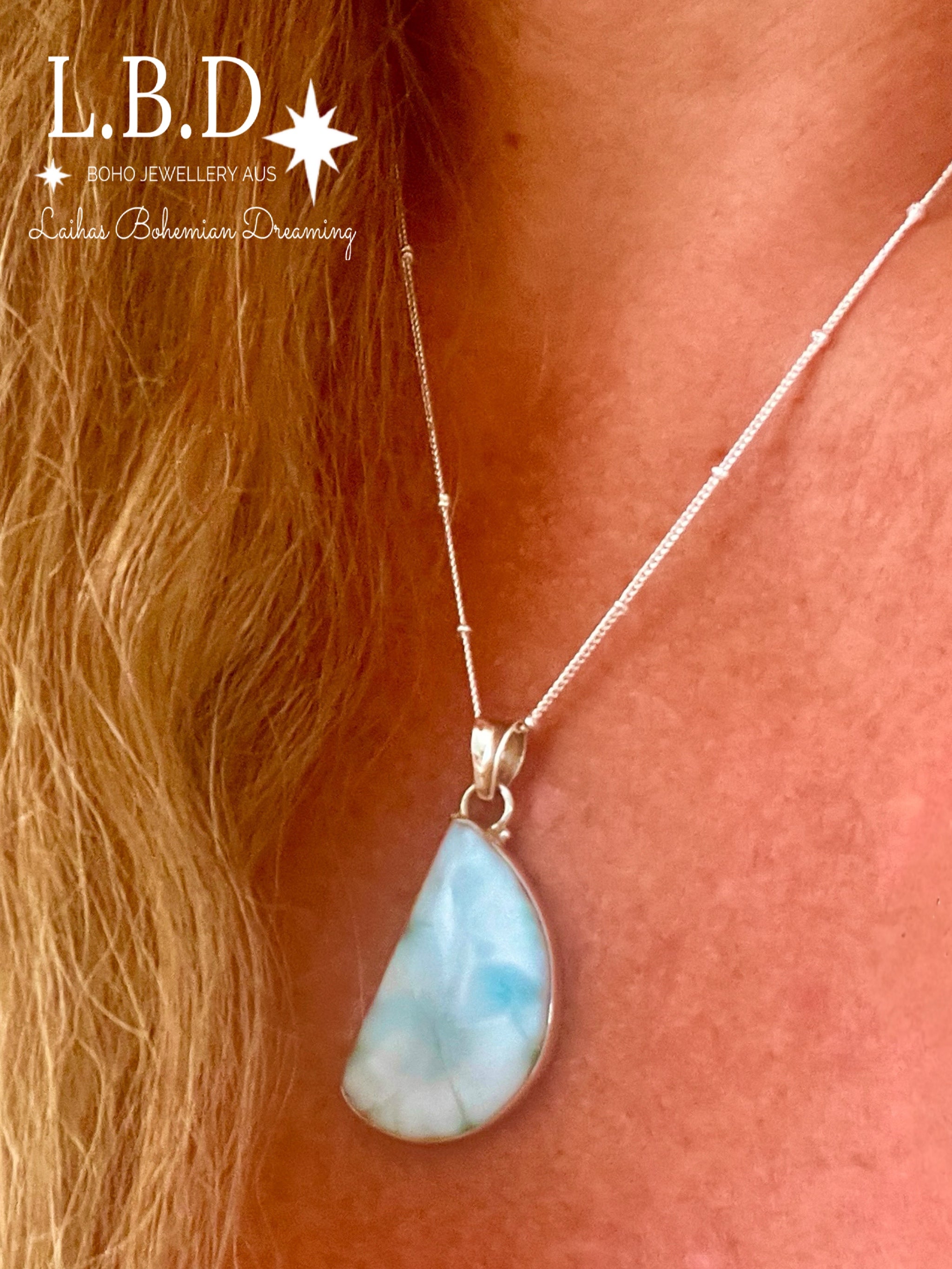 This Gorgeous Handcrafted Larimar Necklace has a Genuine Larimar Stone that is set in solid 925 sterling silver.